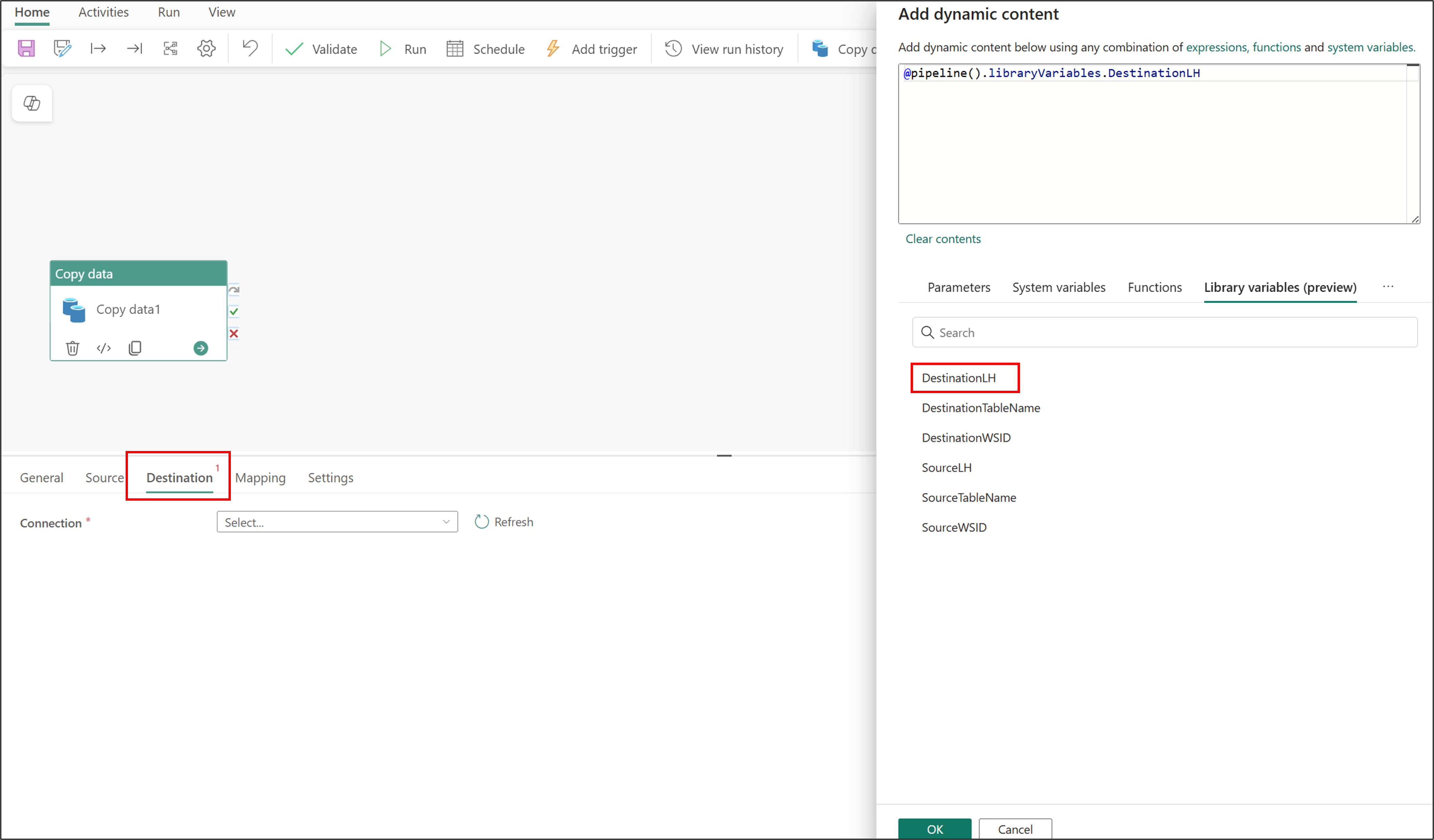 @pipeline().libraryVariables.DestinationWSID. Selecciona Aceptar.