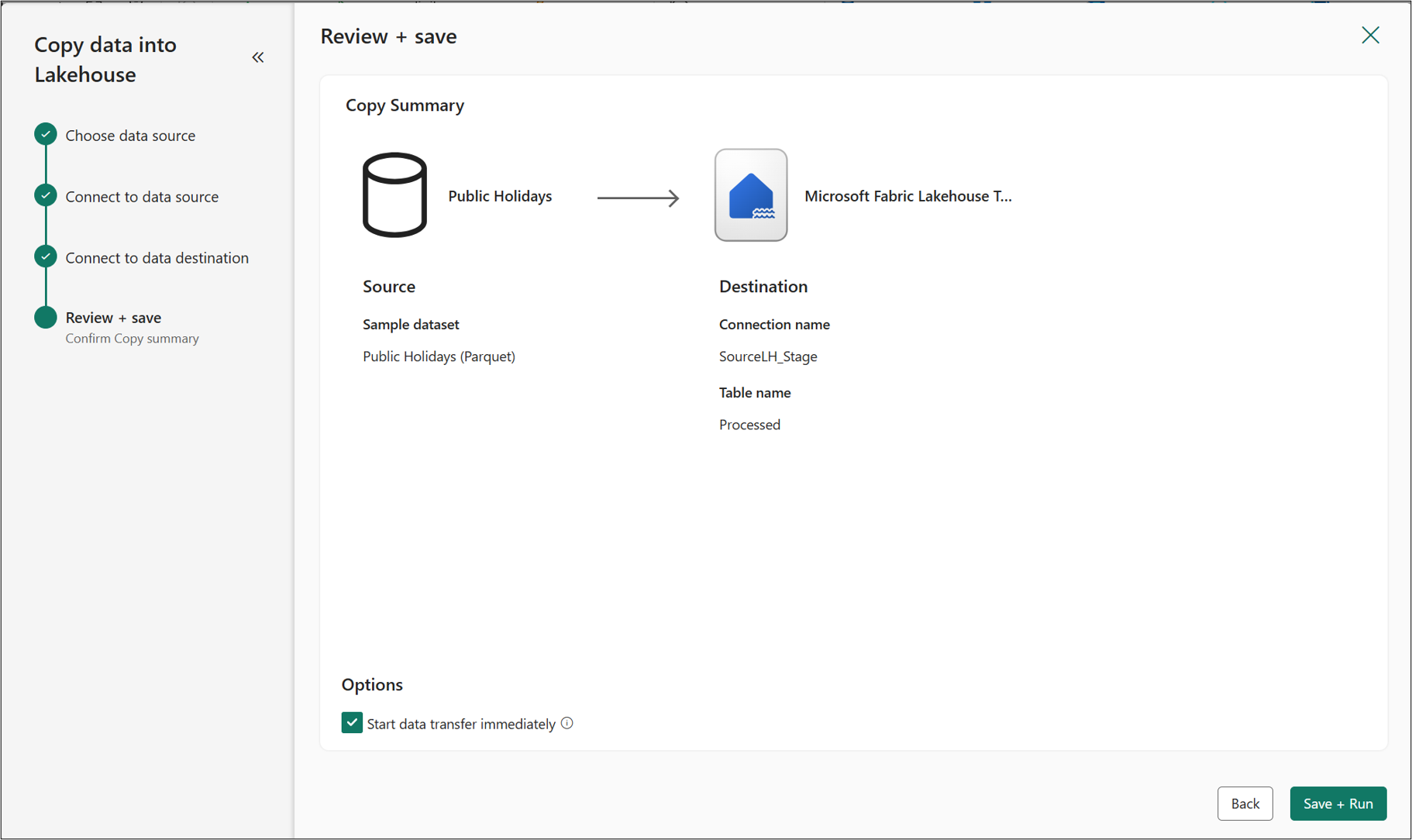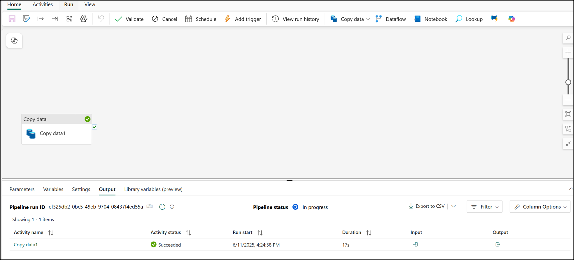 Ahora que la conexión de destino está configurada, guarde la canalización y seleccione Ejecutar. Confirme que se ejecuta correctamente.