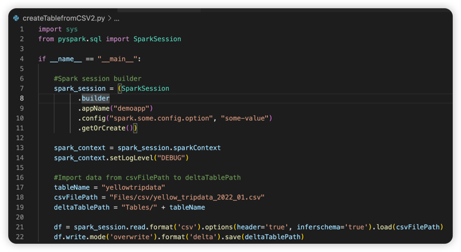 El archivo denominado sparkconf.py contiene un fragmento de código que debe agregar para configurar el objeto SparkConf. Para habilitar la depuración remota, asegúrese de que el objeto SparkConf está configurado correctamente. En la imagen siguiente se muestra la versión original del código fuente.