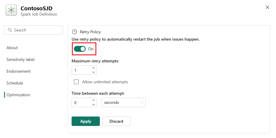 Siga estos pasos para establecer la directiva de reintento para la definición del trabajo de Spark: