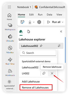 La instancia predeterminada de lakehouse decide qué metastore de Hive se va a usar al ejecutar el cuaderno con Spark SQL. Si se agregan múltiples lakehouses al cuaderno, asegúrese de que, al utilizar Spark SQL, la lakehouse de destino y la lakehouse predeterminada actual procedan del mismo espacio de trabajo.