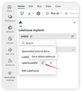En la lista de casas del lago, el icono de anclaje situado junto al nombre de una casa del lago indica que es la casa del lago predeterminada en el cuaderno actual. En el código del cuaderno, si solo se proporciona una ruta de acceso relativa para acceder a los datos desde Microsoft Fabric OneLake, la casa del lago predeterminada se sirve como la carpeta raíz en tiempo de ejecución.