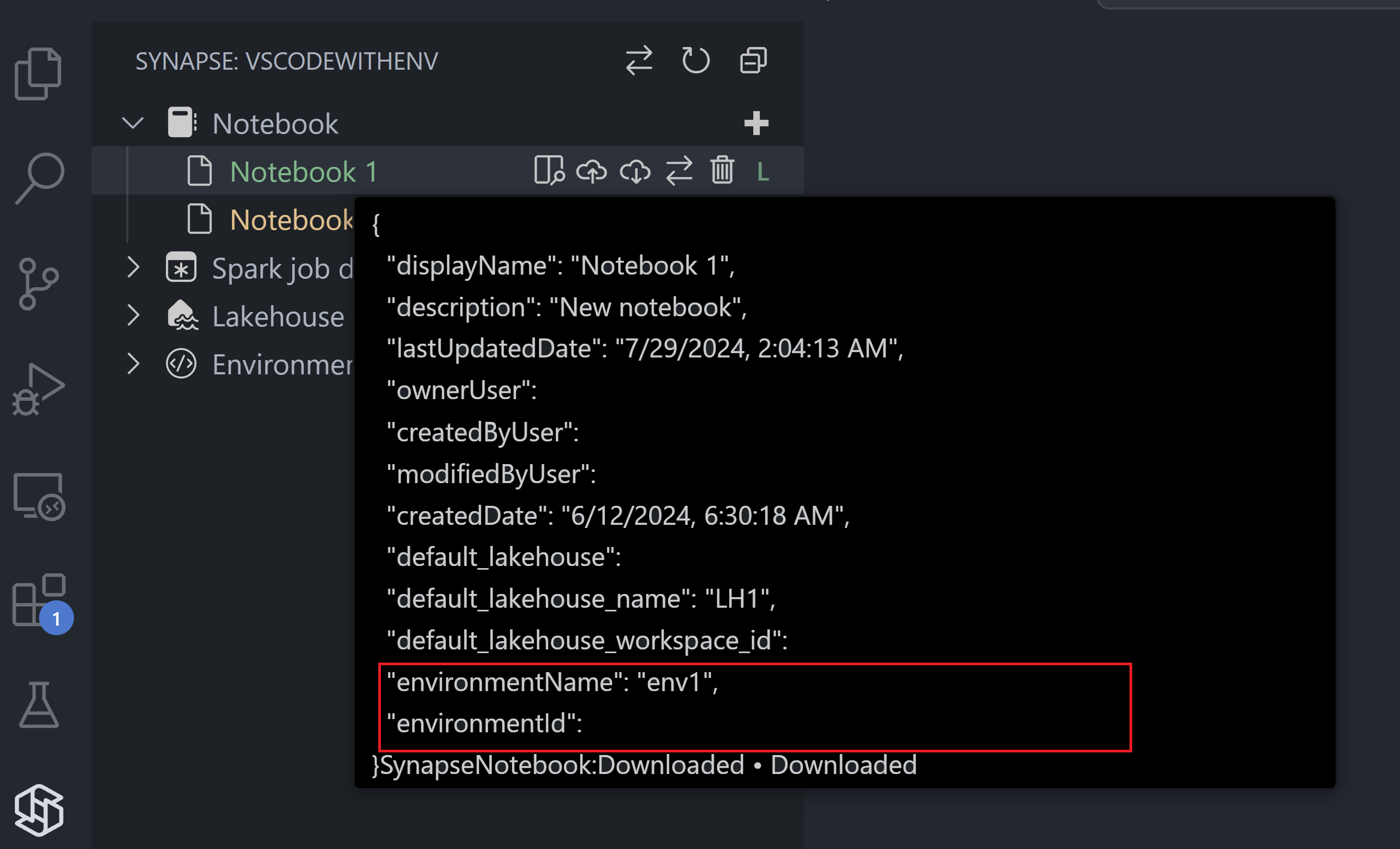 Puede comprobar la asociación entre un entorno y un elemento de código, como un cuaderno. Para comprobar la asociación, mantenga el puntero sobre el nombre del cuaderno, en el panel emergente podrá ver el nombre del entorno asociado y su identificador de elemento.