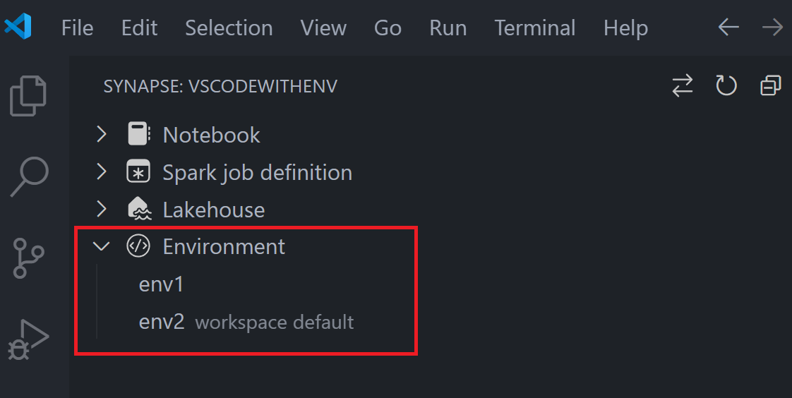 Una vez creado un entorno, puede explorarlo e inspeccionarlo en Visual Studio (VS) Code con la extensión Fabric Data Engineering VS Code. Hay disponible un nuevo nodo denominado Entorno en VS Code. Expanda el nodo Entornos para ver todos los entornos de su área de trabajo.