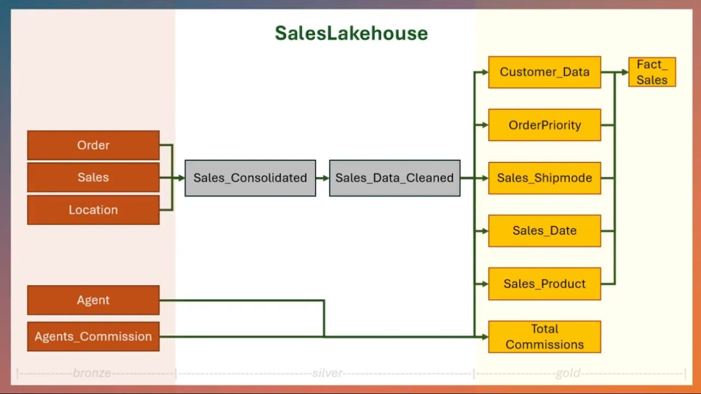 En esta sección, creará las capas de bronce, plata y oro para la arquitectura de medallion en SalesLakehouse. Estas capas definen el flujo de datos basado en linaje para las vistas materializadas del lago.