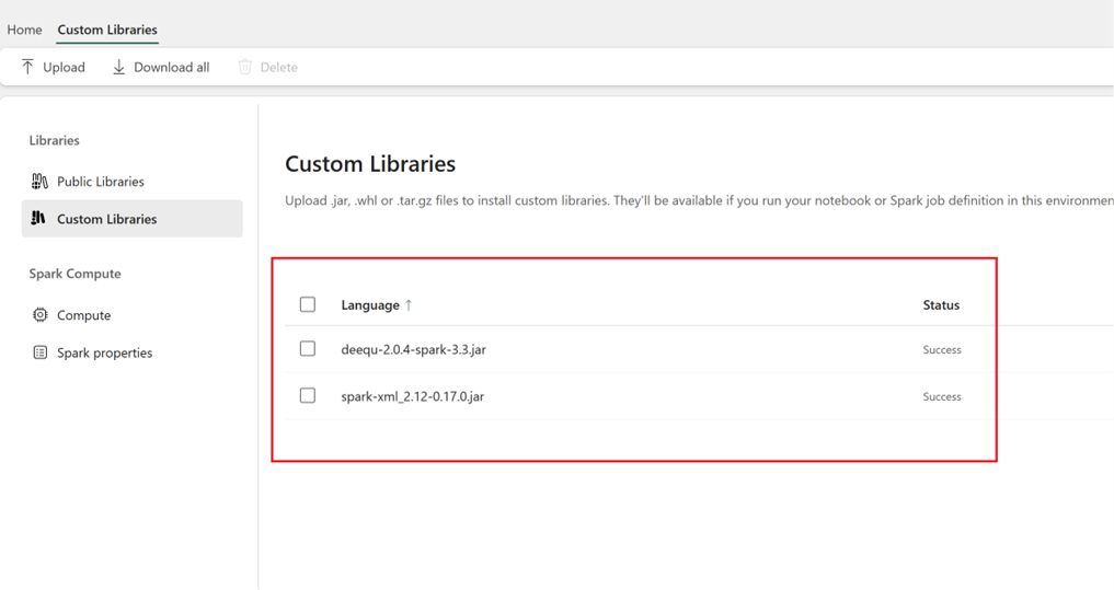 - Una vez que tenga las bibliotecas de Spark, agregue bibliotecas personalizadas a un entorno en Fabric. En Entorno, vaya a Bibliotecas y agregue las bibliotecas: