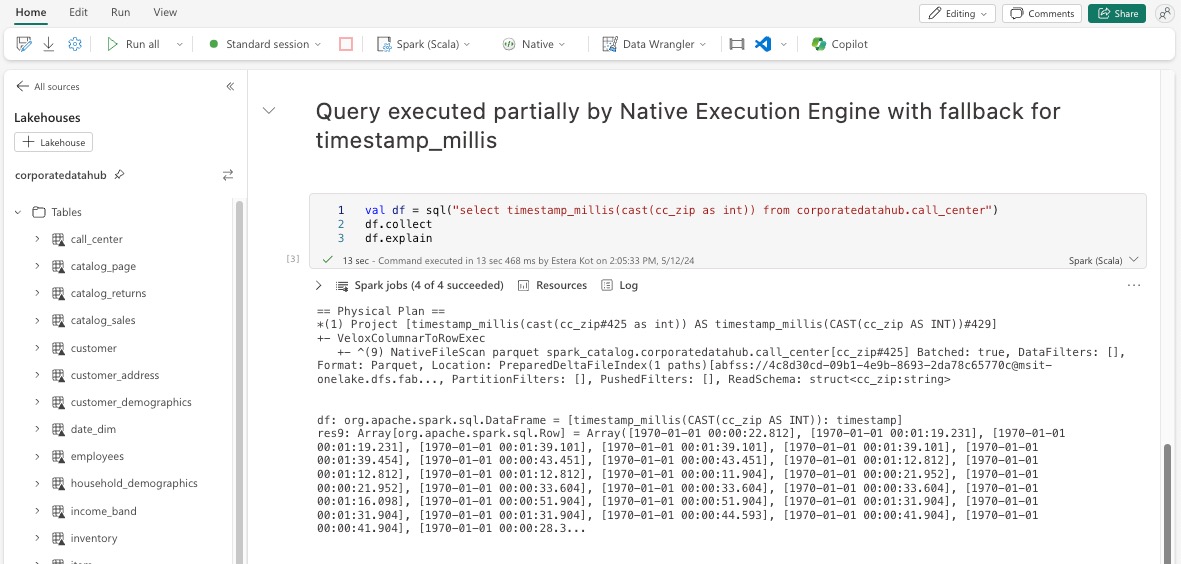 Después de ejecutar la consulta en la que está deshabilitado el motor de ejecución nativo, debe volver a habilitarlo para las celdas posteriores estableciendo spark.native.enabled en true. Este paso es necesario porque Spark ejecuta celdas de código de manera secuencial.