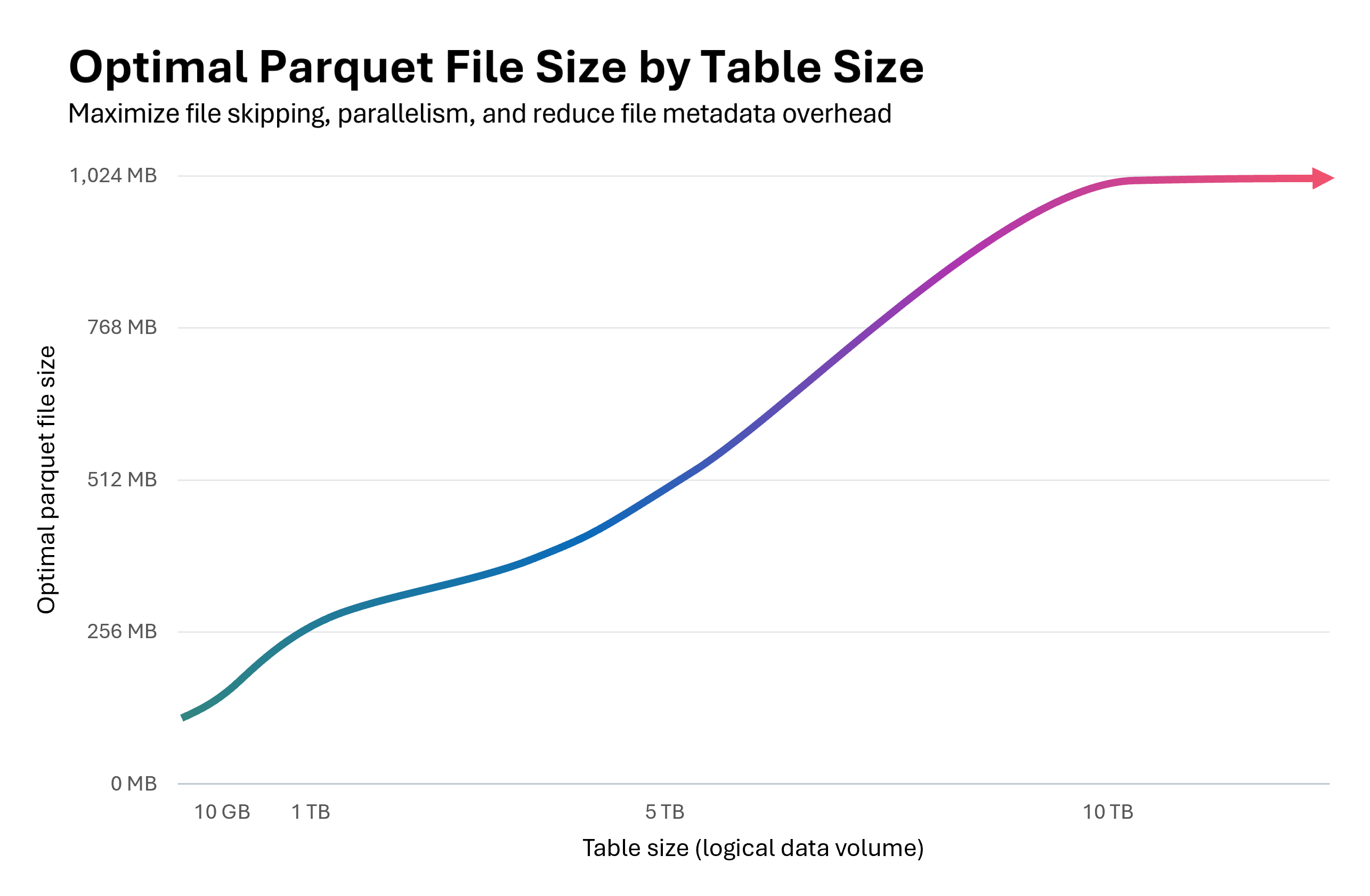 Comenzando con archivos pequeños de 128 MB y luego escalando el tamaño de los archivos parquet a medida que una tabla crece en tamaño tiene beneficios acumulativos: