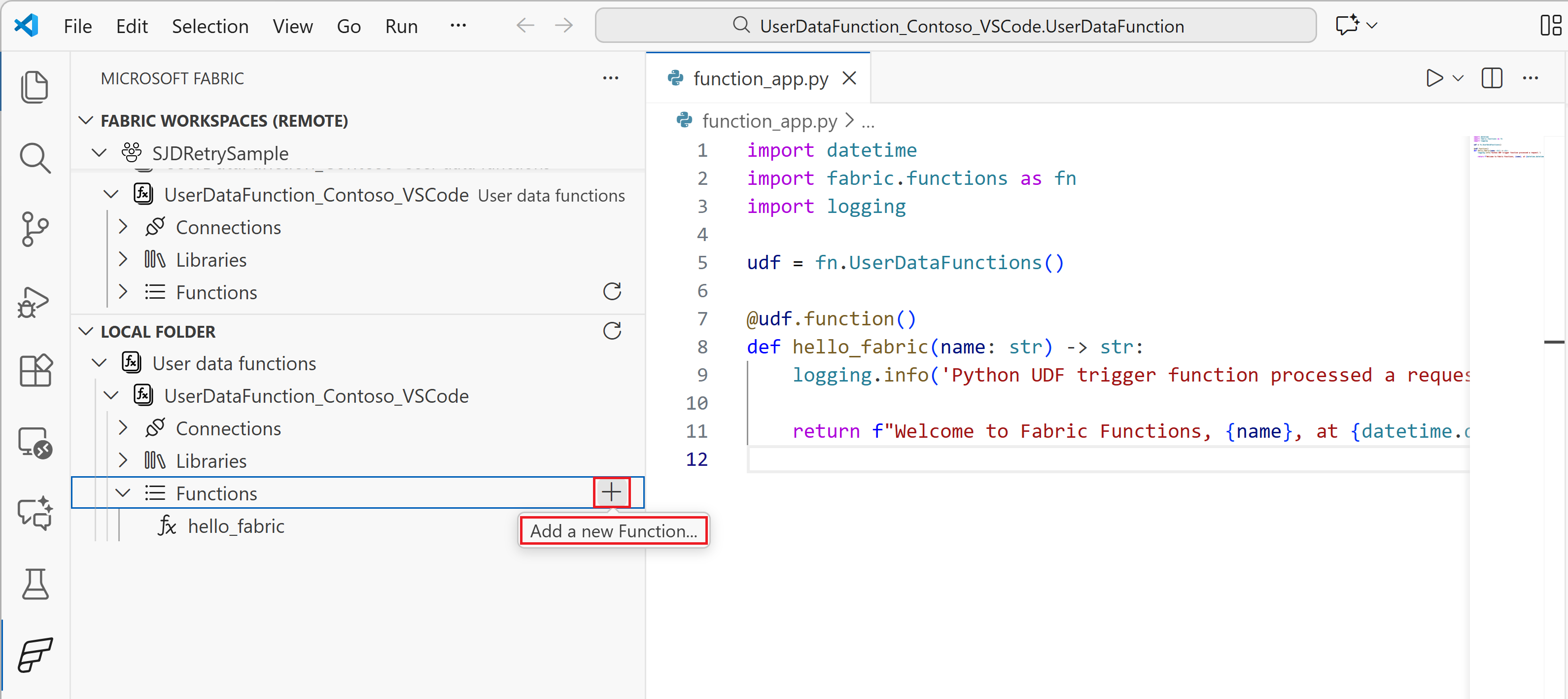 function_app.pypara ver la función predeterminadahello_fabric. Puede modificar esta función o agregar más funciones.@udf.function() def hello_fabric(name: str) -> str: # Use logging to write custom logs to help trace and debug issues logging.info('Python UDF trigger function processed a request.') logging.info('Executing hello fabric function.') return f"Welcome to Fabric Functions, {name}, at {datetime.datetime.now()}!"