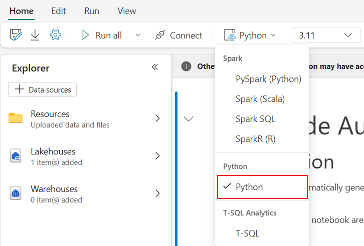 Después de abrir un cuaderno de Fabric, puede cambiar a Python en el menú desplegable del lenguaje en la pestaña Inicio y convertir toda la configuración del cuaderno en Python.