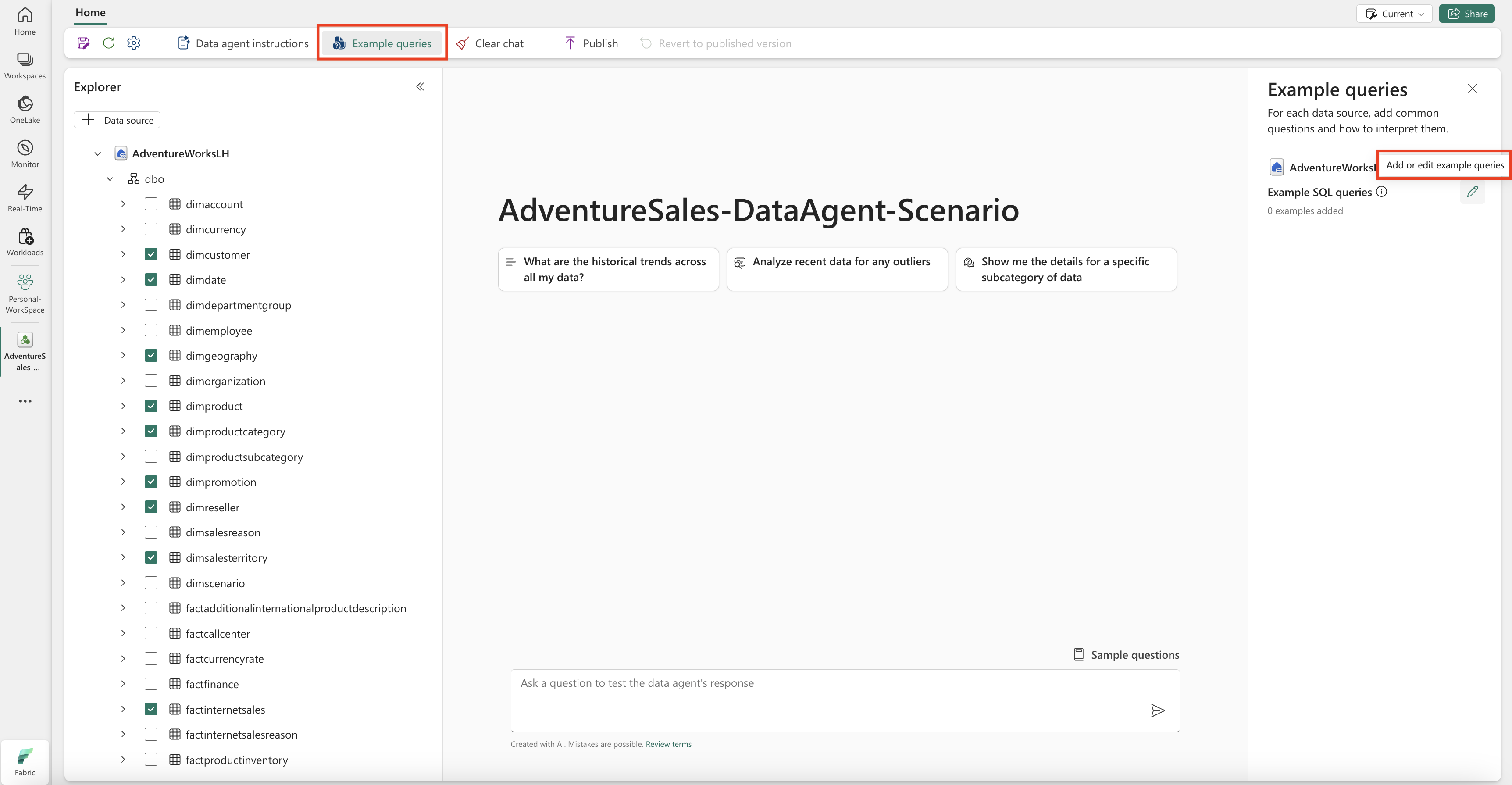 Prueba y revisión del agente de datos de Fabric