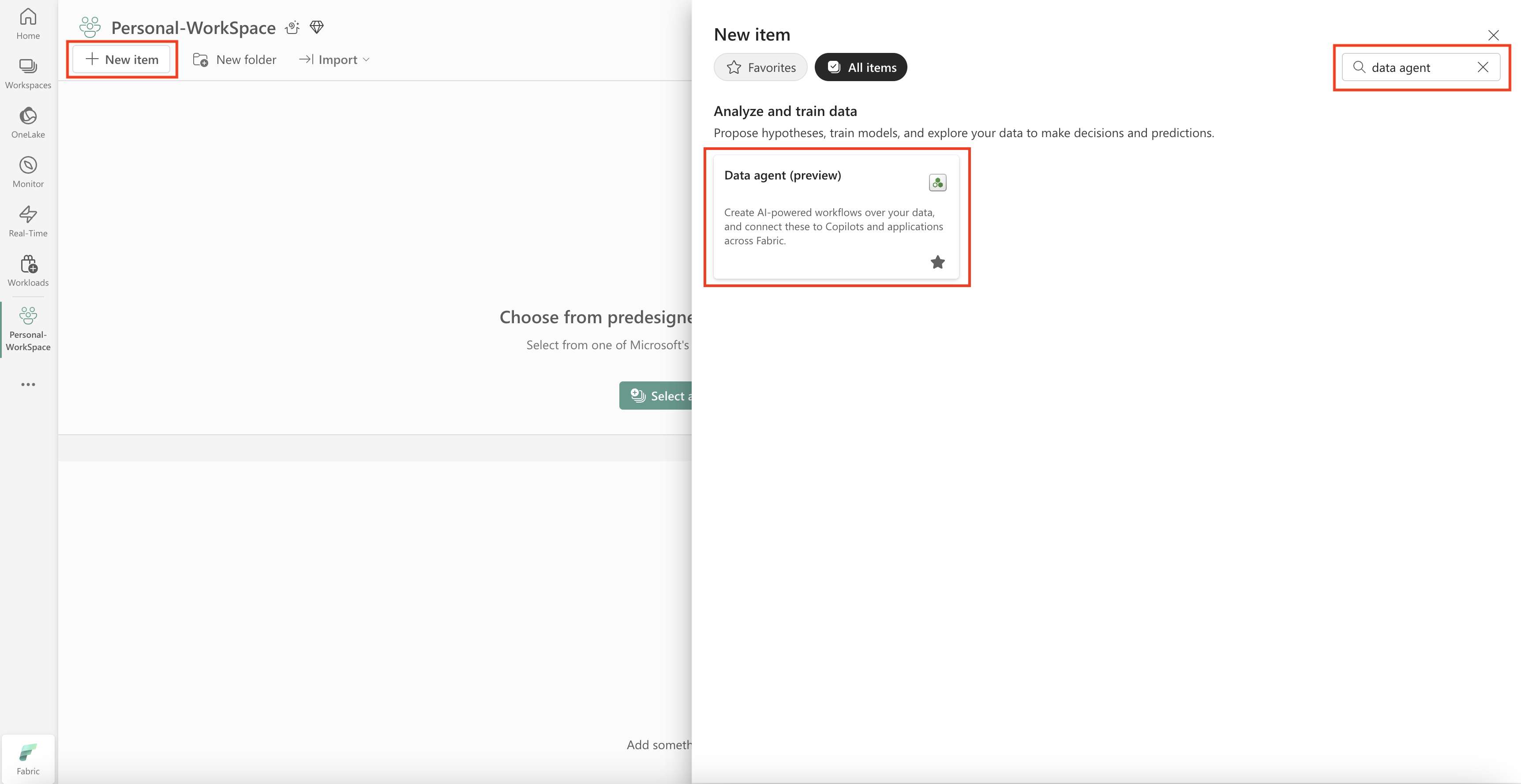 Para crear un nuevo agente de datos de Fabric, navegue hasta su área de trabajo y seleccione el botón + Nuevo elemento, como se muestra en este recorte de pantalla: