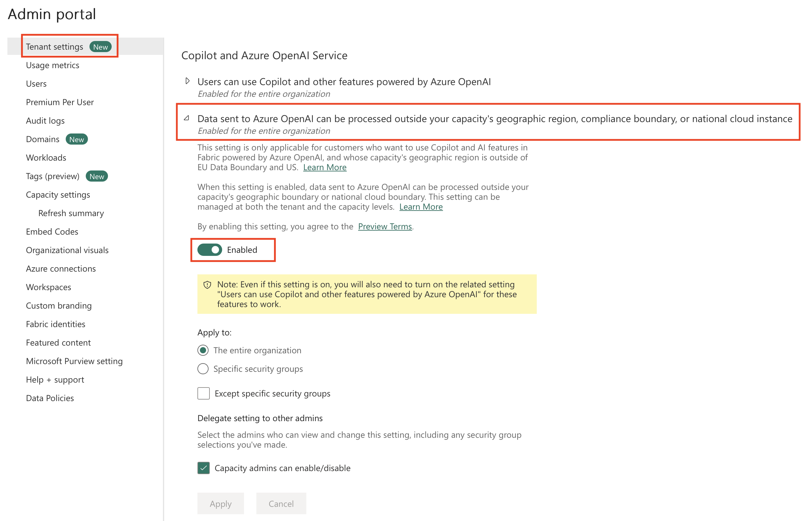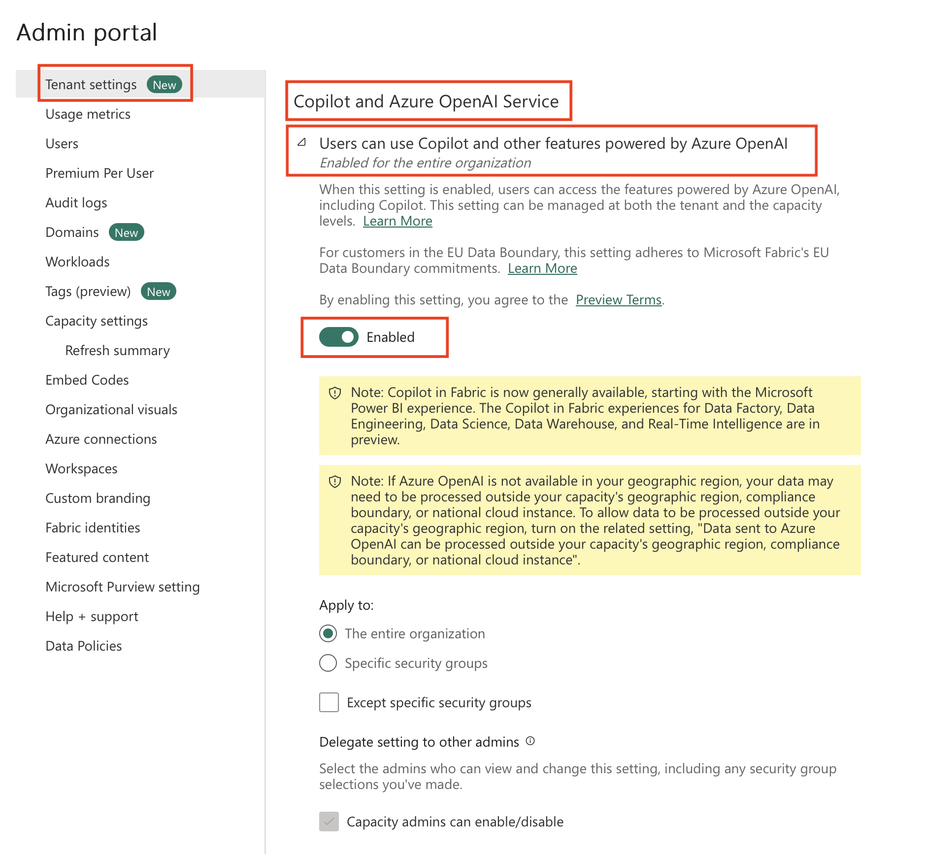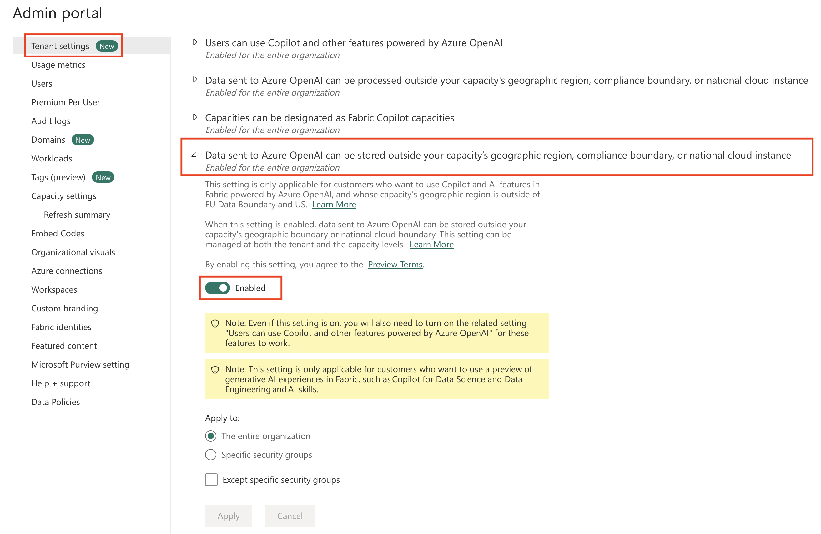 Habilitación del conmutador de inquilino de Copilot y Azure OpenAI