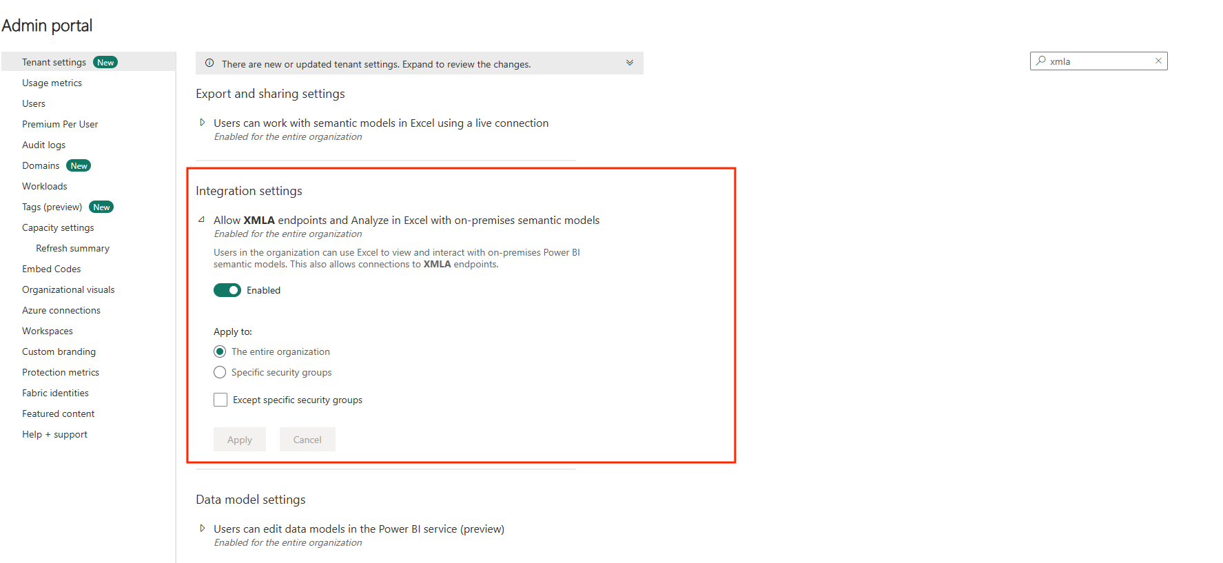 - Busque Permitir puntos de conexión XMLA y Analizar en Excel con conjuntos de datos locales y activelo, como se muestra en la captura de pantalla siguiente: