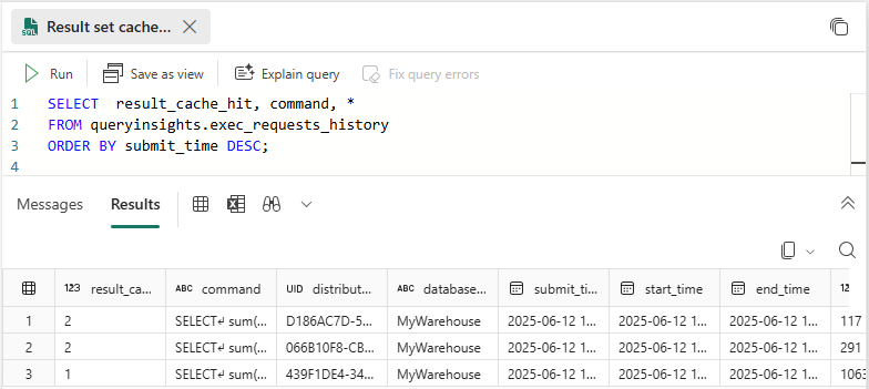 En queryinsights.exec_requests_history, la columna result_cache_hit muestra un valor que indica el uso de caché del conjunto de resultados para cada ejecución de consulta: