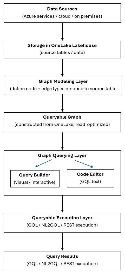 Graph en Microsoft Fabric transforma los datos estructurados almacenados en OneLake en un grafo modelado y consultable. A continuación, puede consultar el gráfico mediante herramientas basadas en objetos visuales o GQL que se ejecutan a través de un motor común para generar resultados visuales, tabulares o mediante programación.