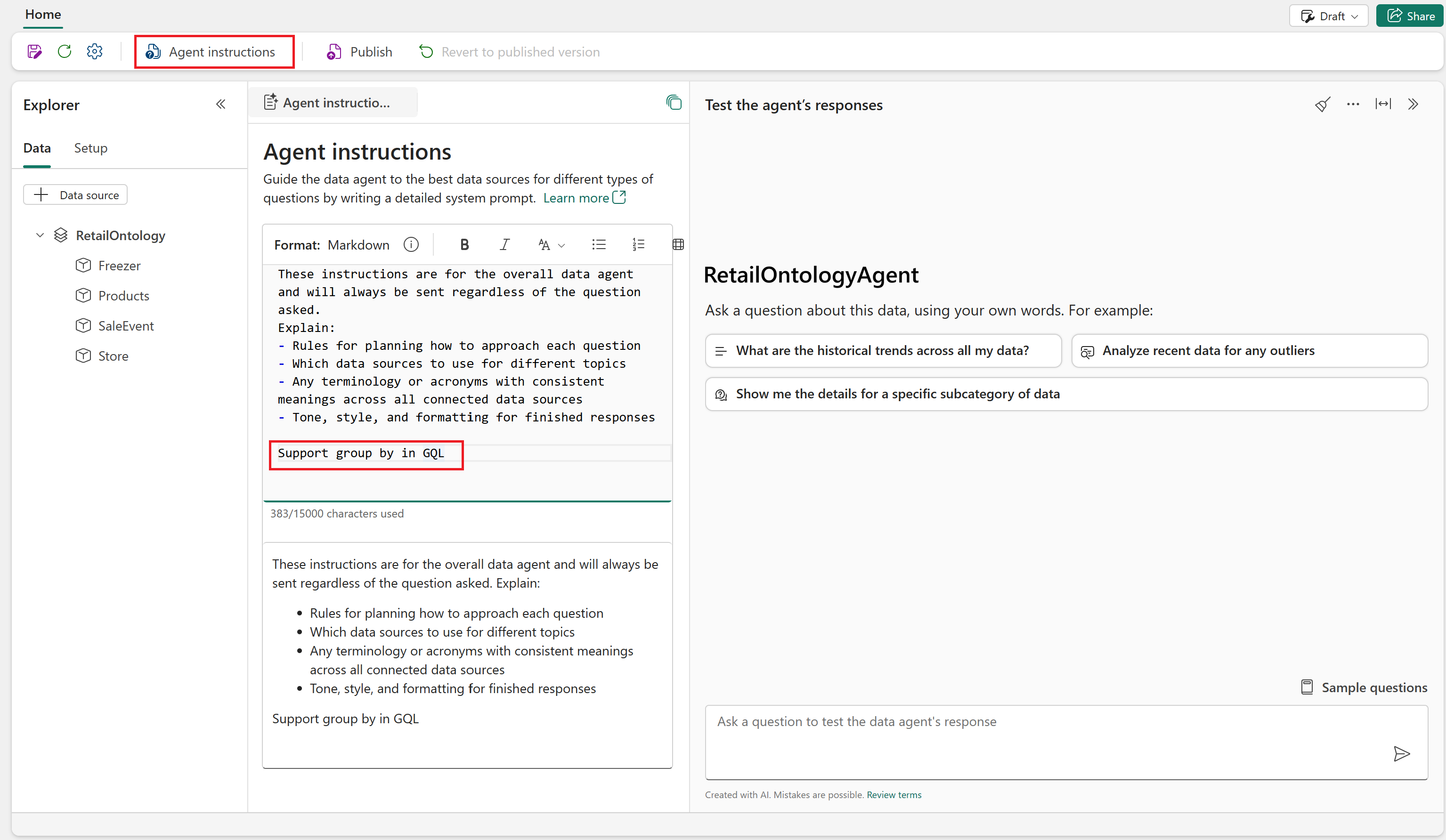 Support group by in GQL. Esta instrucción permite una mejor agregación en los datos de ontología.La instrucción se aplica automáticamente. Opcionalmente, cierre la pestaña Instrucciones del agente .
