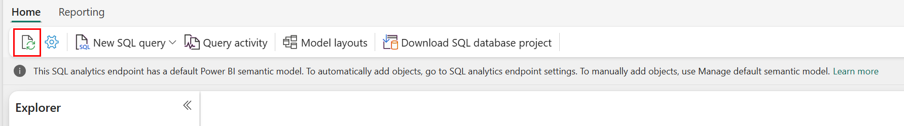 Puede forzar manualmente una actualización del examen automático de metadatos. En la página del punto de conexión de SQL Analytics, seleccione el botón Actualizar como se muestra en la imagen siguiente. Espere algún tiempo y vuelva a consultar los datos para comprobarlos.