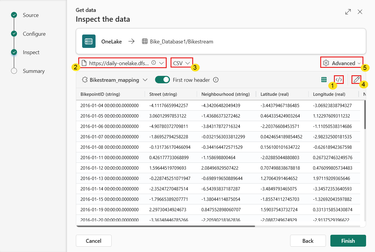 Puede ver, inspeccionar y configurar los datos ingeridos. Los números de la imagen corresponden a estas opciones: