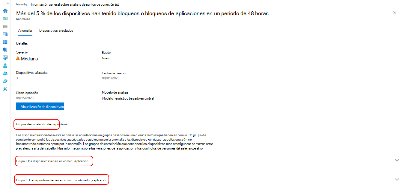 - Para ver más información sobre una anomalía específica, selecciónela en la lista. Revise los detalles, como el nombre de la aplicación, los dispositivos afectados, la primera vez que se detectó el problema y se produjo por última vez, y los grupos de dispositivos que podrían contribuir al problema.