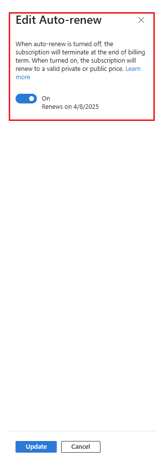 Para activar la renovación automática, en el panel lateral que aparece, cambie el botón de alternancia a Activado y, a continuación, seleccione Actualizar. Ahora puede ver que la renovación automática está activada y la fecha en que se renueva la suscripción.