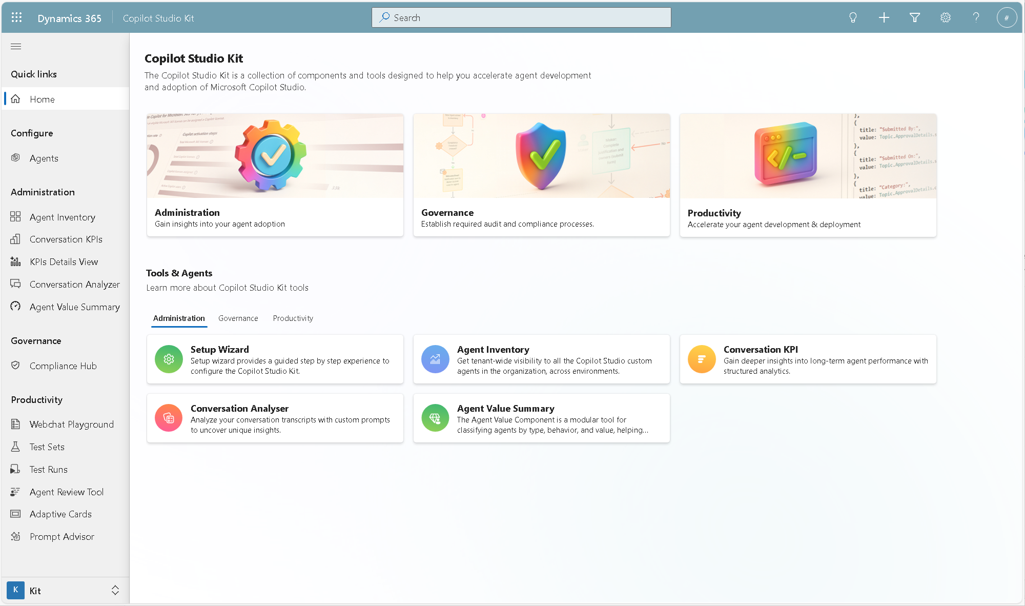 Más información: Define y aplique el cumplimiento del agente con Copilot Studio Kit Compliance Hub