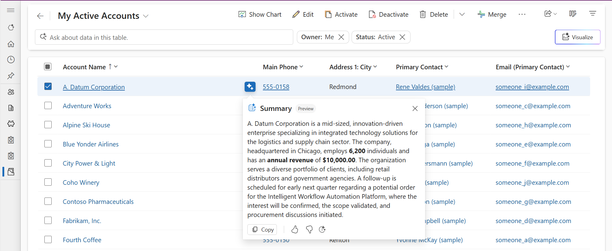 Vistas: Ao explorar rexistros nunha vista, selecciona a acción Resumo en liña xunto a un rexistro para abrir o resumo nunha xanela emerxente.