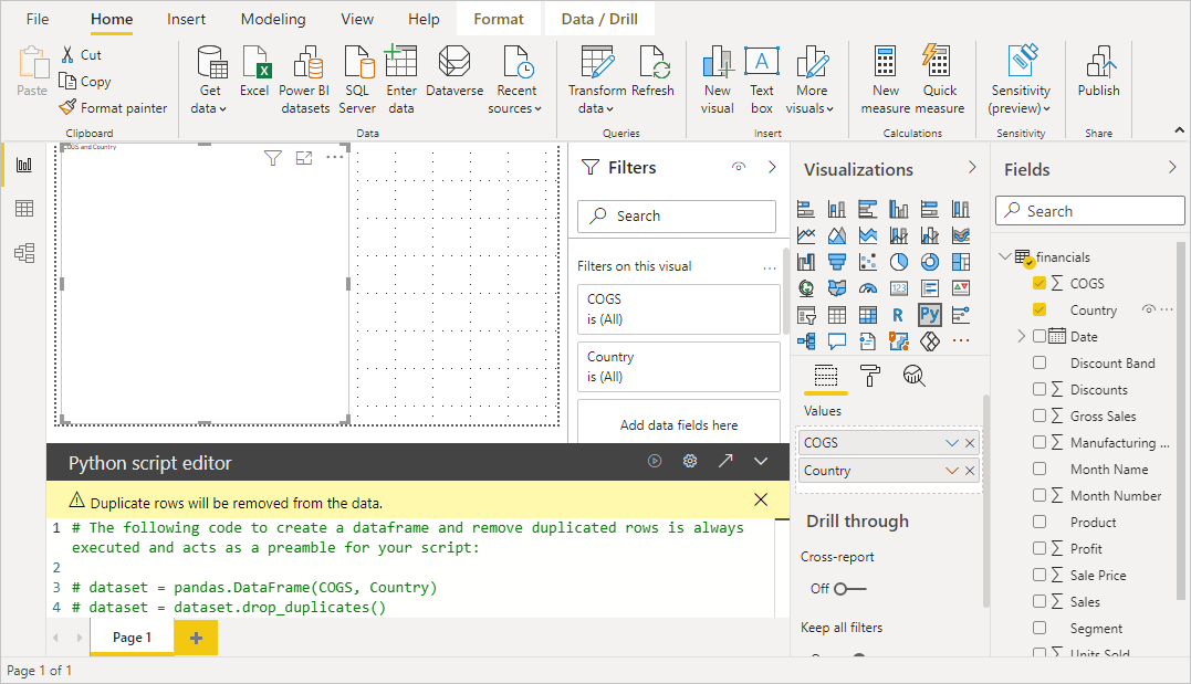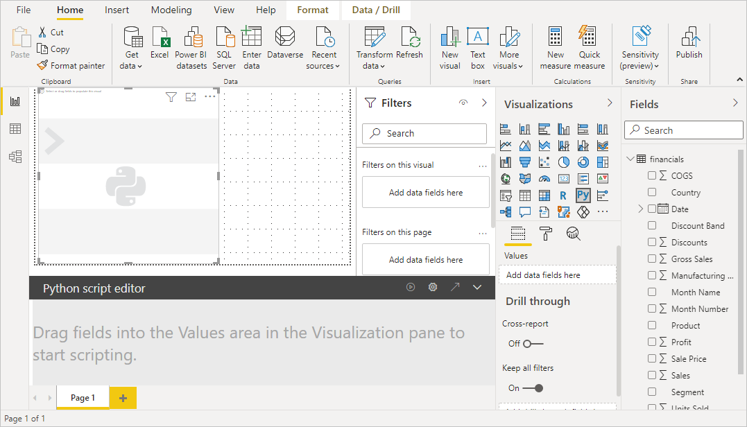 Agregue una visualización de Python al lienzo. Si no ha habilitado los objetos visuales de scripts, se le pedirá que lo haga.