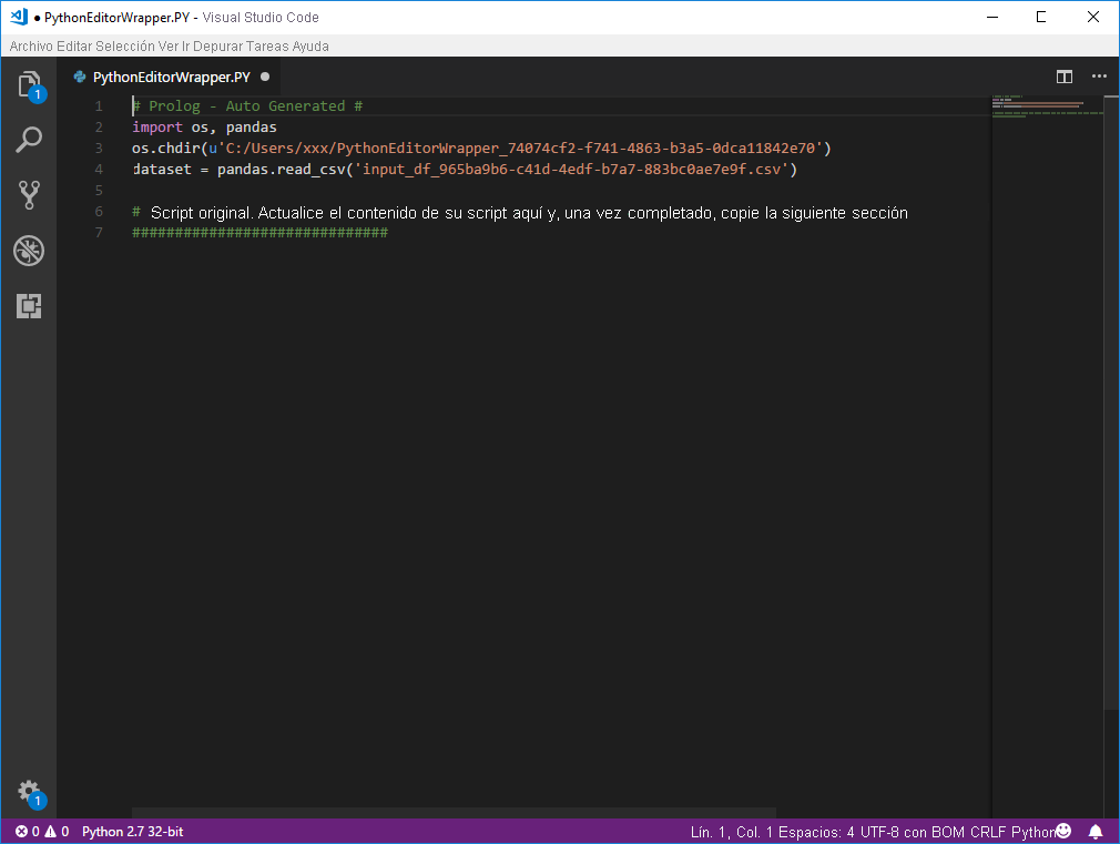 Cualquier script creado en el panel Editor de script de Python de Power BI Desktop aparece a partir de la línea 4 en el IDE de Python. En este momento puede crear el script de Python en el IDE de Python. Una vez que esté completo el script de Python en el IDE de Python, deberá copiarlo y pegarlo en el panel Editor de script de Python de Power BI Desktop, excepto las tres primeras líneas del script que Power BI Desktop ha generado de forma automática. No vuelva a copiar las tres primeras líneas del script en Power BI Desktop, esas líneas solo se han usado para importar los datos en el IDE de Python desde Power BI Desktop.