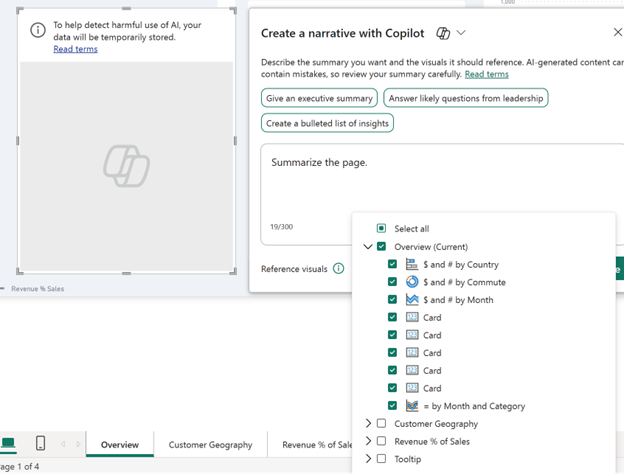 En Power BI Desktop y el servicio Power BI, puede usar Copilot para Power BI para crear rápidamente una narración sobre un informe con tan solo unos clics. Esta narración puede resumir todo el informe, páginas específicas o incluso objetos visuales específicos que seleccione. Puede adaptar el tono y la especificidad de la narración con indicaciones sugeridas y personalizadas, lo que lo convierte en algo extremadamente versátil.