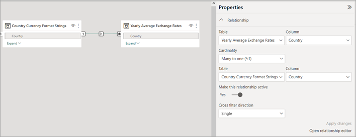 Cree relaciones entre sus nuevas tablas de tipos de cambio promedio anual y cadenas de formato de moneda de país o región, y entre la tabla de tipos de cambio promedio anual y la tabla de fechas existente.
