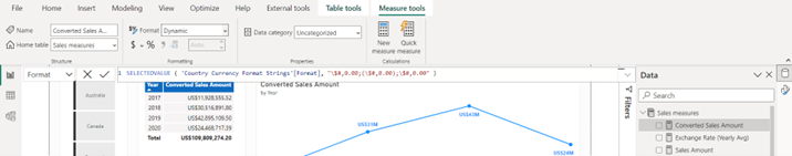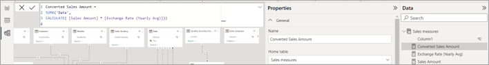 Converted Sales Amount = SUMX('Date', CALCULATE( [Sales Amount] * [Exchange Rate (Yearly Avg)]))El grupo de medidas de Ventas ahora debería tener el siguiente aspecto: