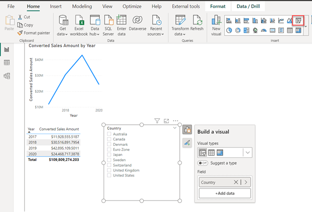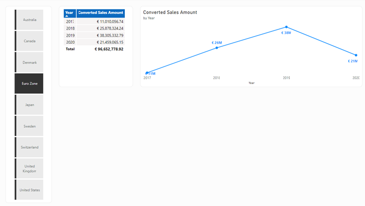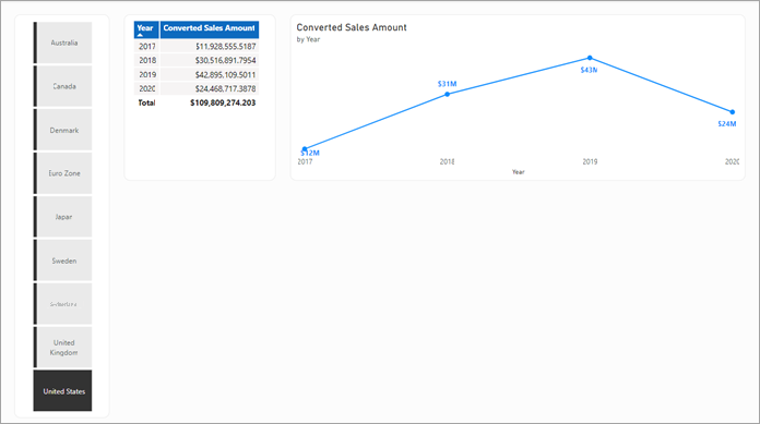 Al seleccionar diferentes nombres de país o región en el segmentador, los objetos visuales muestran el resultado de la medida de ventas convertidas, pero no en el formato correcto para ese país o región.