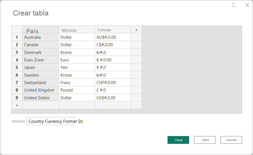 En el cuadro de diálogo Crear tabla , escriba Cadenas de formato de moneda de país o región en el campo Nombre y, a continuación, copie y pegue la tabla siguiente: