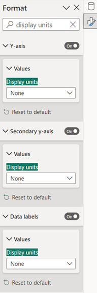 Los objetos visuales tienen opciones de formato que podrían afectar a cómo aparece la cadena de formato. Si el formato aparece inesperadamente en un objeto visual, vaya a las opcionesvisuales>, busque Unidades de visualización y cámbielas de Automático a Ninguno.