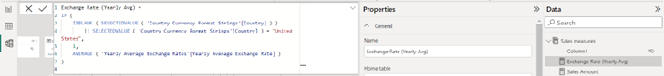 Exchange Rate (Yearly Avg) = IF ( ISBLANK ( SELECTEDVALUE ( 'Country/Region Currency Format Strings'[Country/Region] ) ) || SELECTEDVALUE ( 'Country/Region Currency Format Strings'[Country/Region] ) = "United States", 1, AVERAGE ( 'Yearly Average Exchange Rates'[Yearly Average Exchange Rate] ) )Ahora, cree otra medida para convertir la medida Sales Amount a otras monedas. Haga clic con el botón derecho en Medidas de ventas, seleccione Nueva medida, escriba la siguiente expresión en la barra de fórmulas DAX y presione Entrar:
