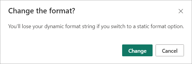 Para eliminar la cadena de formato dinámico y volver a usar una cadena de formato estático, en la lista desplegable Formato de sección >Formato , seleccione una opción de formato diferente. Dado que no hay forma de deshacer esta acción, aparecerá un cuadro de diálogo preguntando si desea continuar. Si desea volver a usar una cadena de formato dinámico de nuevo, deberá volver a escribir la expresión DAX.