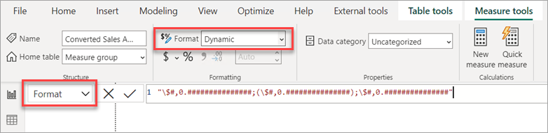 - En la cinta Herramientas de medida , en la sección Formato , seleccione Dinámico en el cuadro de lista Formato . Aparece una nueva lista desplegable con Formato ya seleccionado a la izquierda de la barra de fórmulas DAX. Esta lista desplegable le permite cambiar entre la expresión DAX de medida estática y la expresión DAX de cadena de formato dinámica. La cadena de formato estático que usó antes de cambiar a Dinámica se rellena previamente como una cadena en la barra de fórmulas DAX.