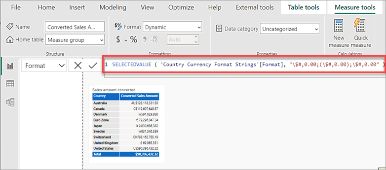 Sobrescriba la cadena con una expresión DAX que genere la cadena de formato correcta para la medida. Por ejemplo, la expresión siguiente busca la cadena de formato de moneda que desea de una tabla Cadenas de formato de moneda de país o región :