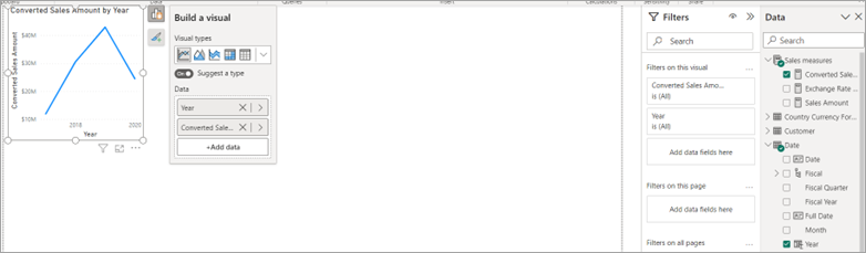 En el panel Datos, >Medidas de ventas, seleccione Importe de ventas convertido. Sin seleccionar ningún otro lugar, seleccione también Año en la tabla Fecha .