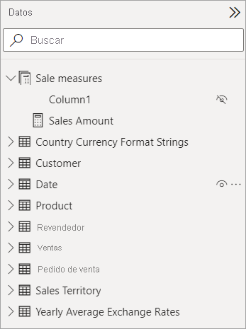 En Medidas de ventas, haga clic con el botón derecho en Columna1 y seleccione Ocultar en la vista de informe. Este cambio hace que Sales mide un grupo de medida, que ahora aparece en la parte superior del panel Datos con un icono de grupo de medida, de la siguiente manera: