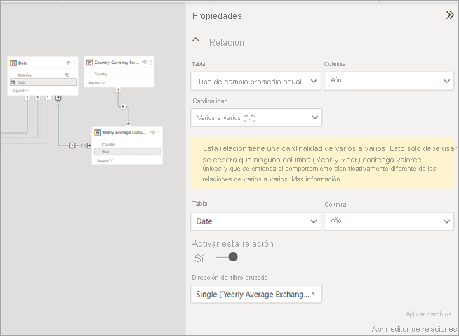 - Dirección del filtro cruzado: Simple ('Tipo de cambio medio anual' filtra 'Fecha')