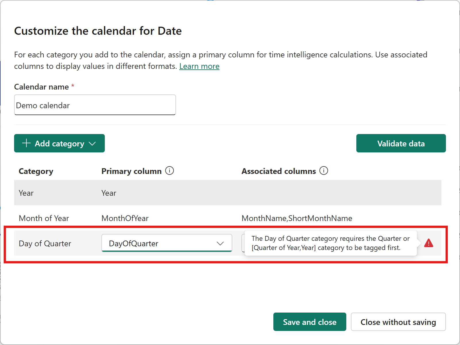 Definir un calendario implica asignarle un nombre y asignar columnas a categorías. Cada categoría representa una unidad de tiempo y hay categorías de columna específicas disponibles. Debe asignar al menos una columna principal a una categoría para guardar el calendario. Cada categoría debe tener una columna principal y puede tener cero o más columnas asociadas. Cada vez que las columnas asociadas a una categoría están en contexto, Power BI sabe qué unidad de tiempo presentan. Además, para algunas funciones, como TOTALMTD Power BI, usa la columna principal asignada a la categoría pertinente del calendario al que se hace referencia para realizar el cálculo solicitado. Para asignar una columna a una categoría, seleccione la categoría en el menú Agregar categoría y, a continuación, seleccione las columnas principales y opcionales asociadas.