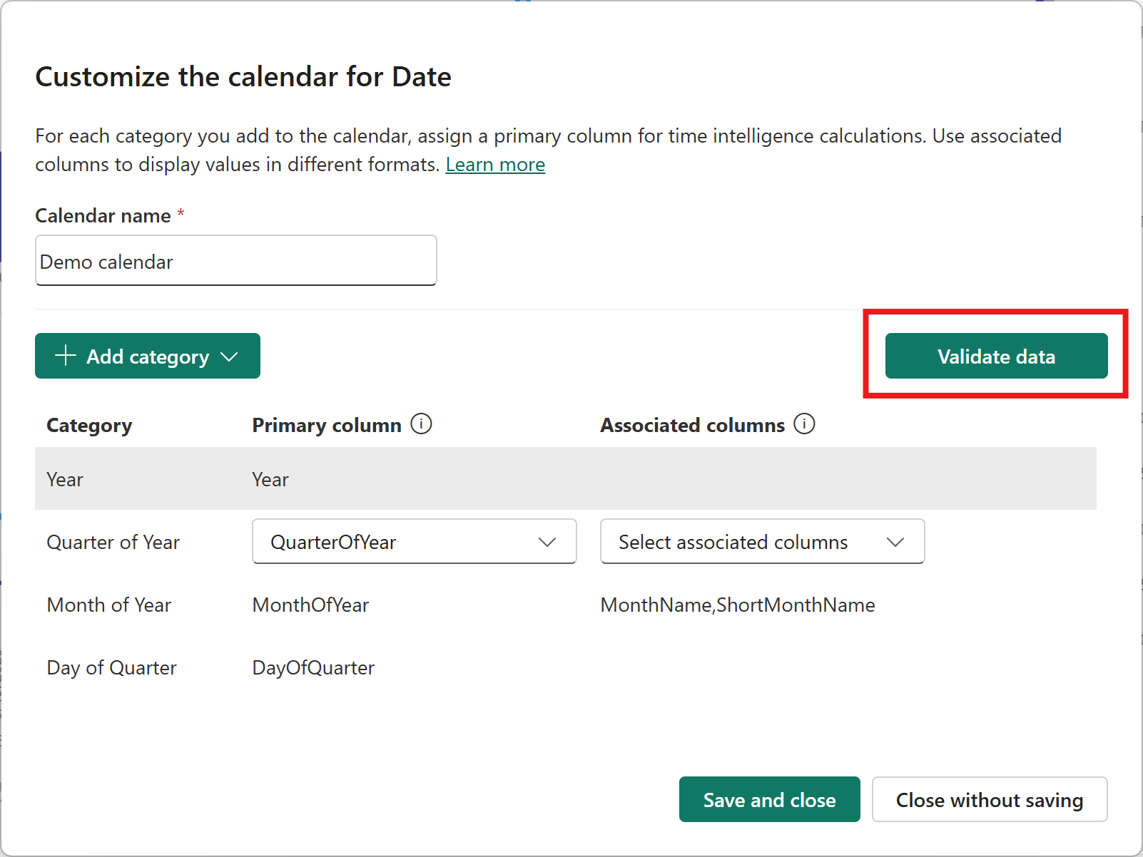 - Se recomienda asociar solo las columnas del calendario que quiera usar en los cálculos de inteligencia temporal.