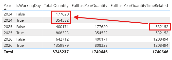 Todos los valores de OneYearAgoQuantity y OneYearAgoQuantityTimeRelated para 2025 coinciden con la cantidad total de exactamente un año antes (2024), para el mismo valor de IsWorkingDay .