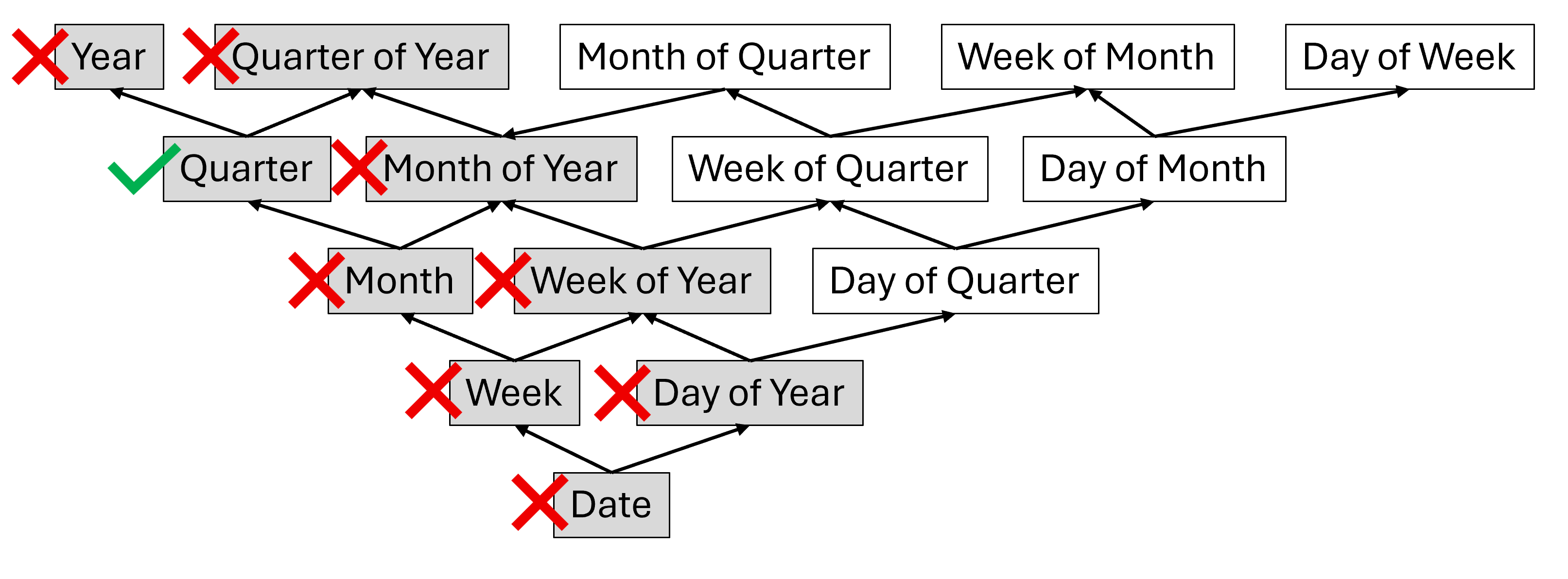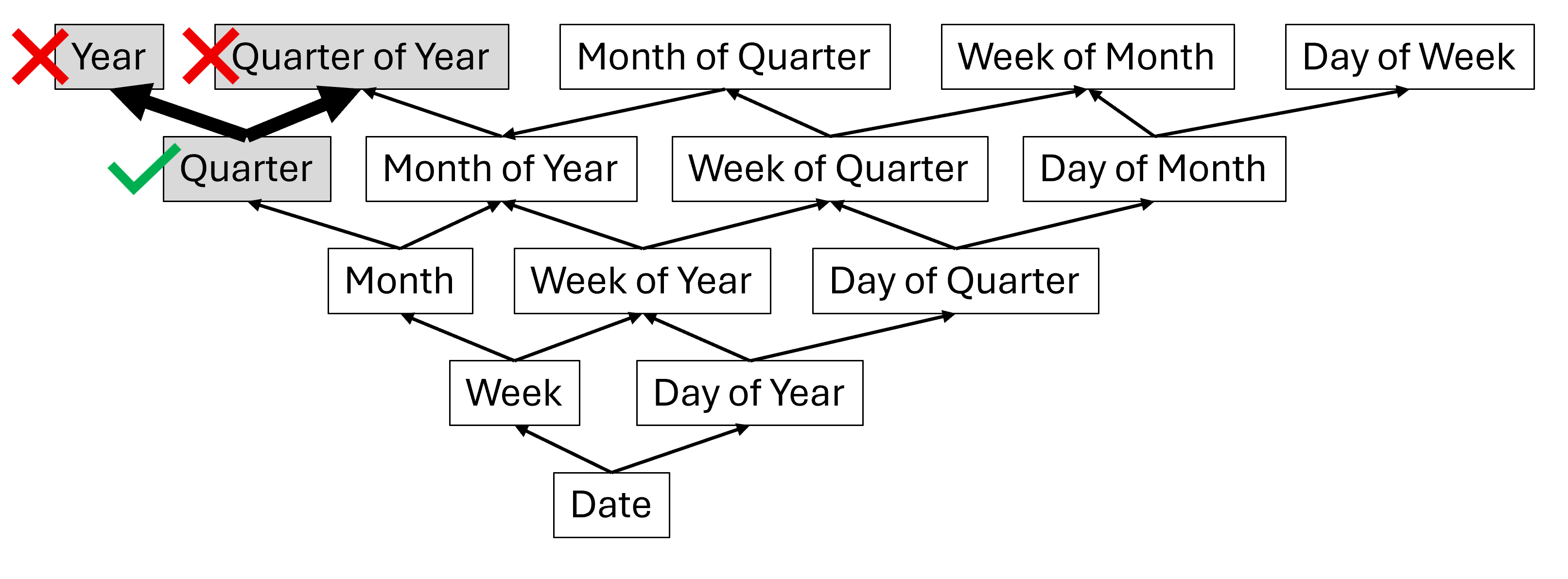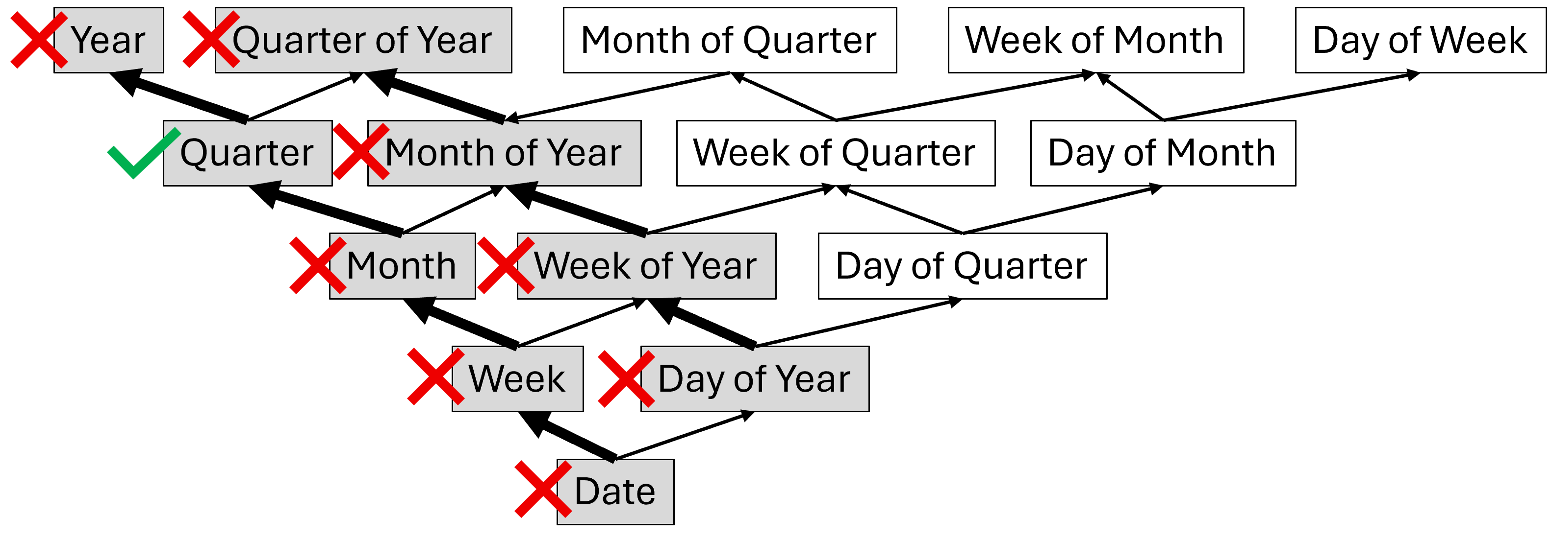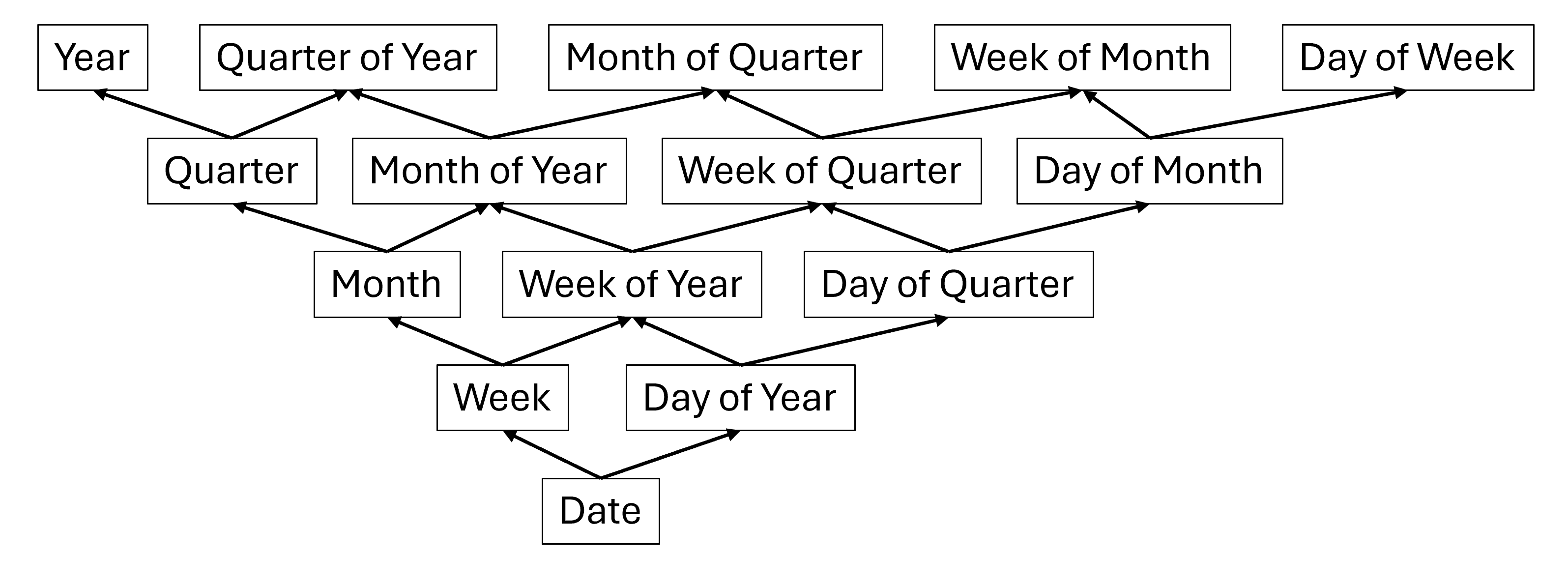 | Categoría | Description | Tipo | Cardinalidad de ejemplo en un calendario gregoriano | Valores de columna de ejemplo en un calendario gregoriano |