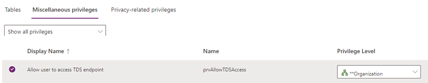 Ademais de activar a configuración do ambiente, ao usar o control a nivel de usuario individual, o administrador debe garantir que os roles de seguranza axeitados teñan activado o privilexio Permitir que o usuario acceda ao punto final de TDS e que todos os usuarios que precisen acceso ao punto final de TDS sexan membros deses roles. Power Platform