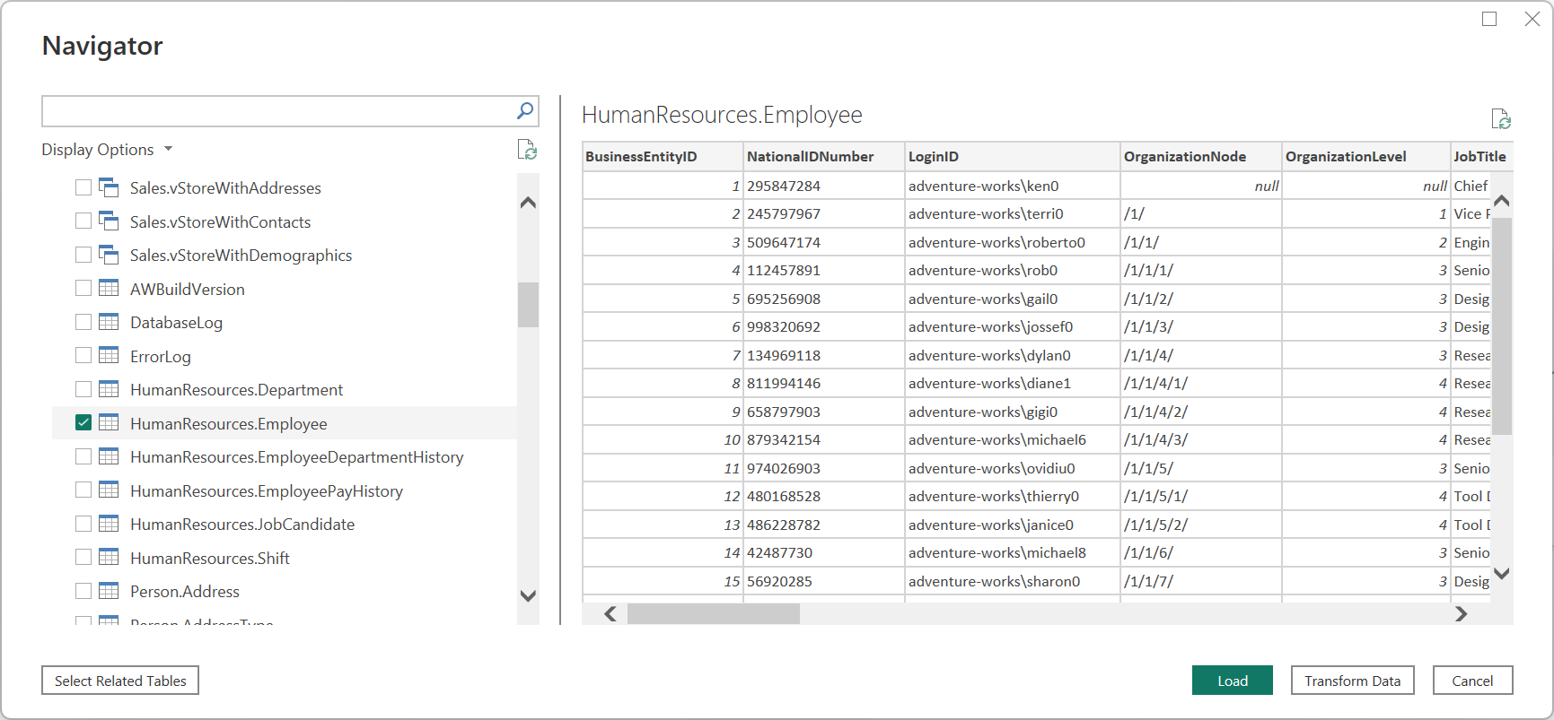 En Navigator, seleccione la información de la base de datos que desee y, después, seleccione Load cargar los datos o Transform Data para seguir transformando los datos en Power Query editor.