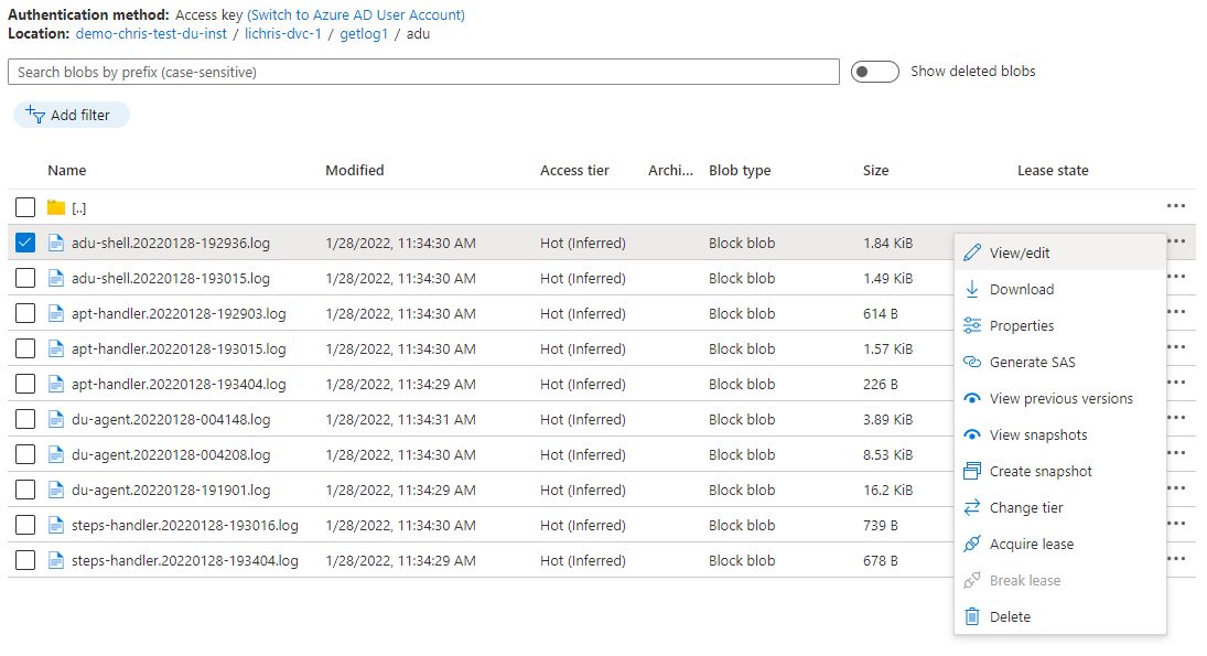 Puede ver el contenido del archivo de registro seleccionando el nombre de archivo y seleccionando el elemento de menú (puntos suspensivos) y haciendo clic en Ver o editar. También puede descargar o eliminar el archivo de registro seleccionando las opciones etiquetadas respectivamente.