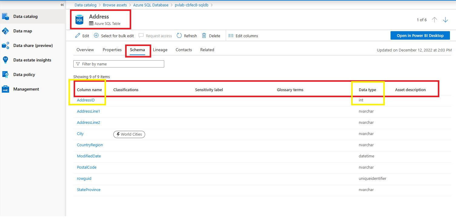 En otras palabras, el atributo de relación columns relaciona el Azure SQL Table con una lista de Azure SQL columnas que se muestran en la pestaña Esquema.